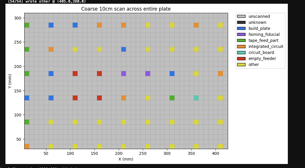 First, wrote an OpenPnP plugin that scanned the build plate in a 10mm x 10mm grid. Each image was stored and tagged as feed_tape, empty_feeder, homing_fiducial, build_plate, and integrated_circut for loose parts.