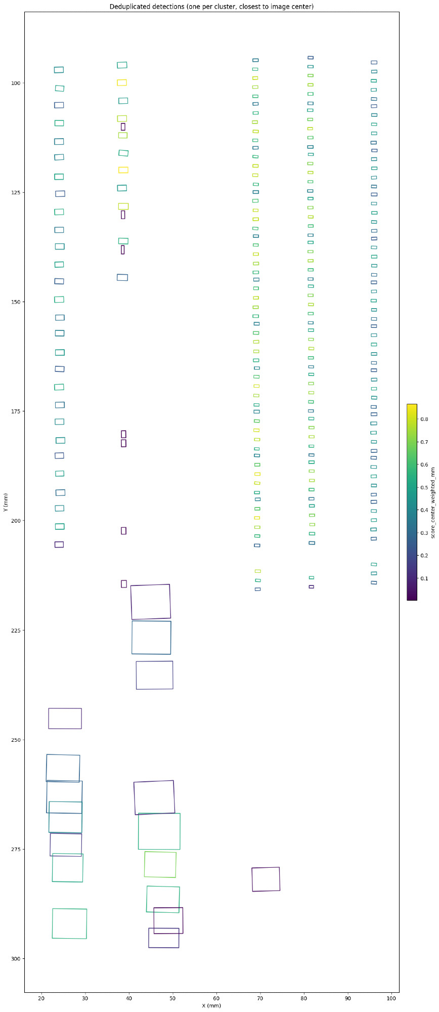 The build plate on a LumenPnP is large, and scanning the whole thing for each run would take an hour and generate gigabytes of useless data. We can use embeddings and some understanding of the build plate to find parts faster.